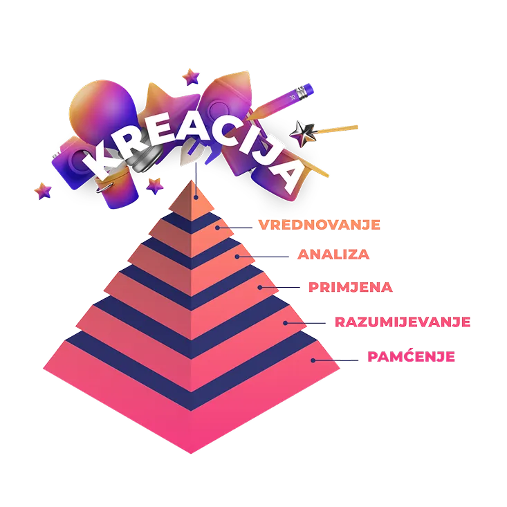 Iznimnoj popularnosti projekta doprinosi pristup izrade programa po modelu bloomove taksonomije. Dok većina obrazovnih materijala njeguje tek prvih par stepenica piramide, edukacijski materijali koje pripremamo sa stručnjacima iz industrije potiču učenike na najveću (i najzabavniju) razinu kognitivnog razvoja – kreativno stvaranje.